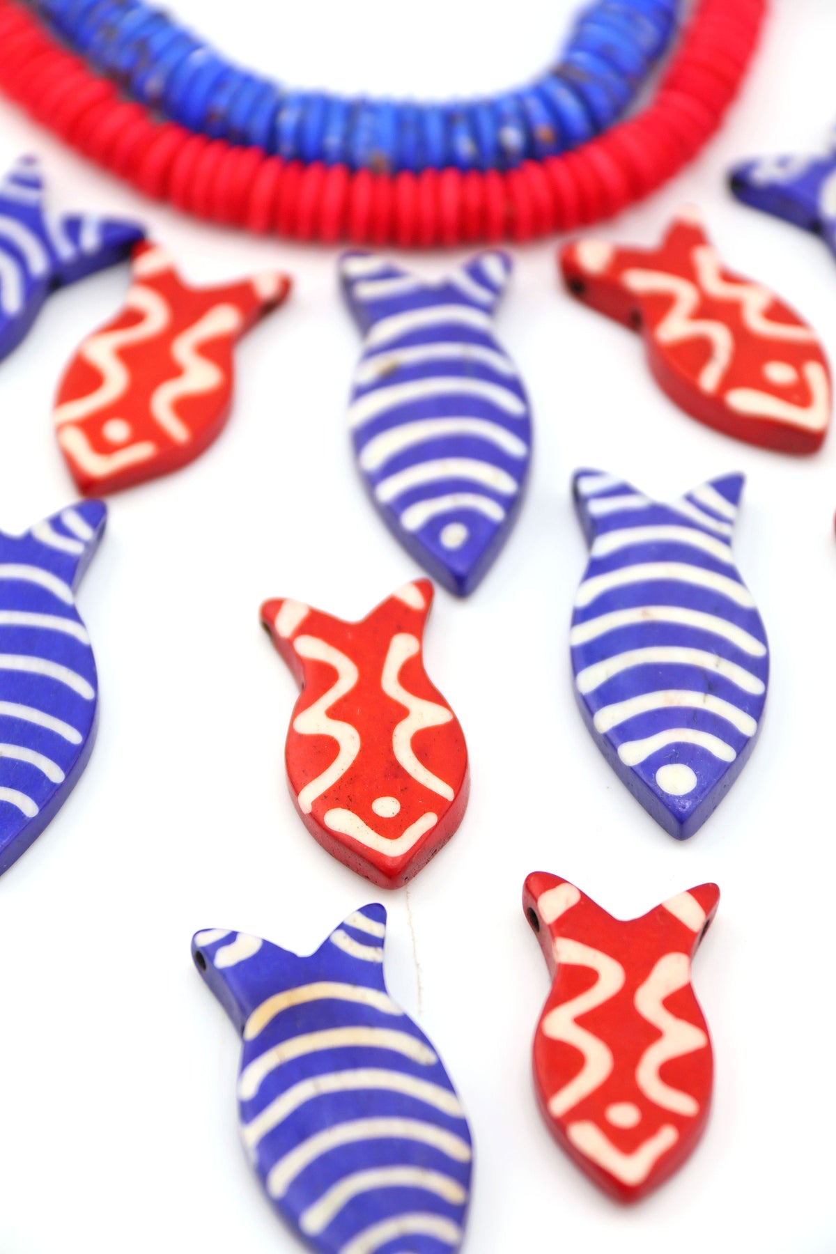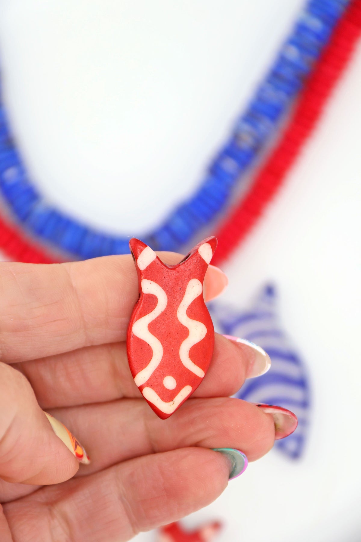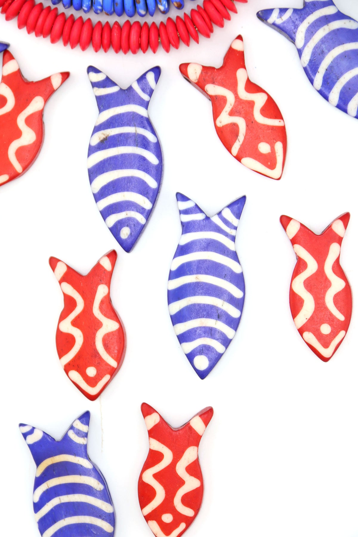 Whether you're deep in your sardine summer or just hooked on coastal charm, these striped bone fish beads are the perfect catch. Each bead is hand-carved and dyed by artisans in India, showcasing bold cream stripes and squiggles over your choice of rich cobalt blue or vibrant red—giving each fish a bold nautical pop with an old-world feel.