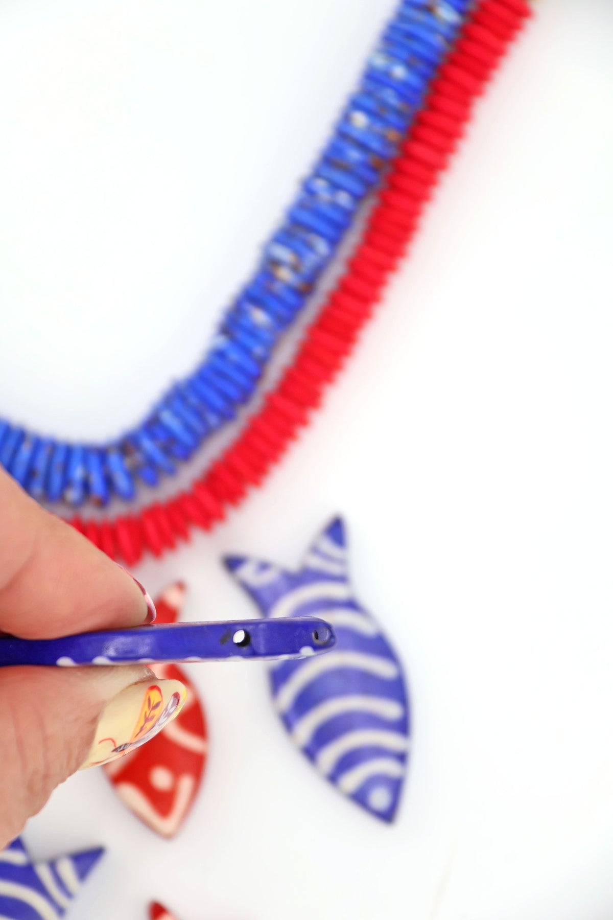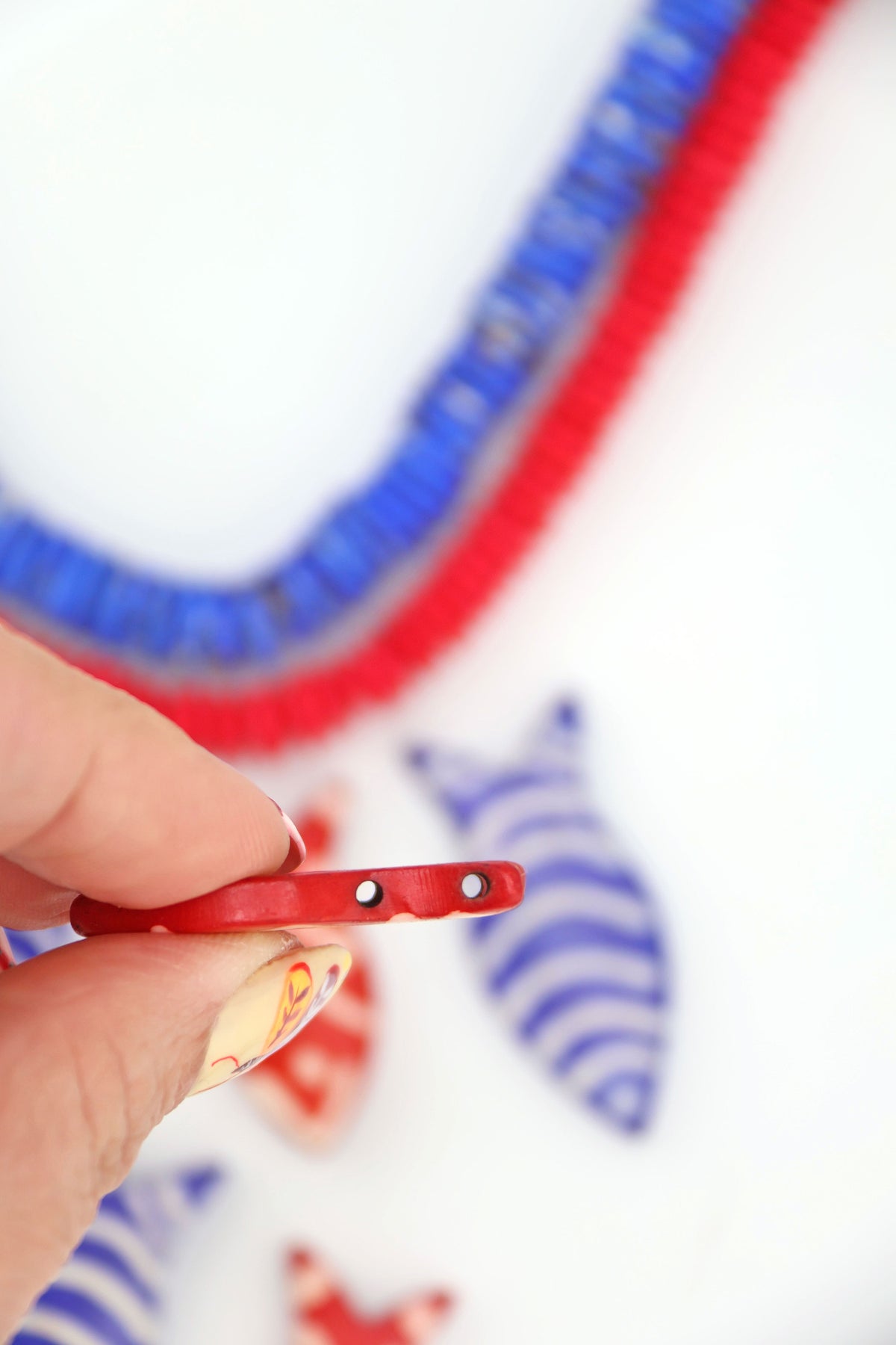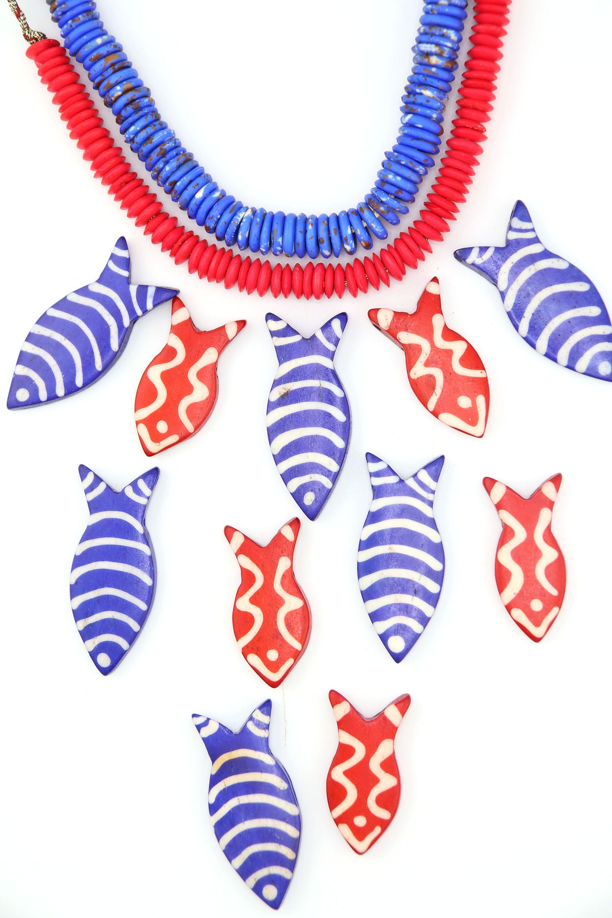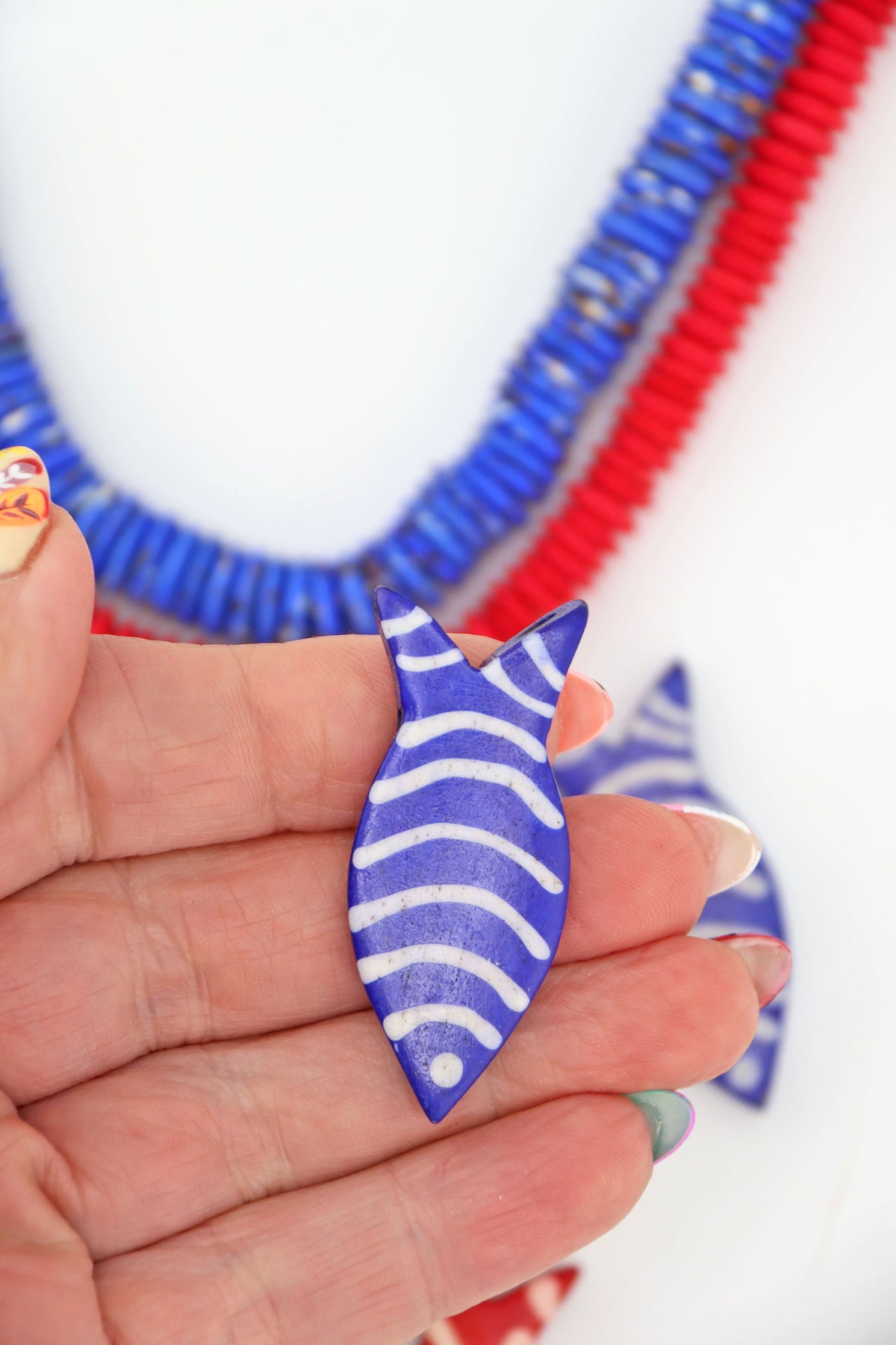 Whether you're deep in your sardine summer or just hooked on coastal charm, these striped bone fish beads are the perfect catch. Each bead is hand-carved and dyed by artisans in India, showcasing bold cream stripes and squiggles over your choice of rich cobalt blue or vibrant red—giving each fish a bold nautical pop with an old-world feel.
