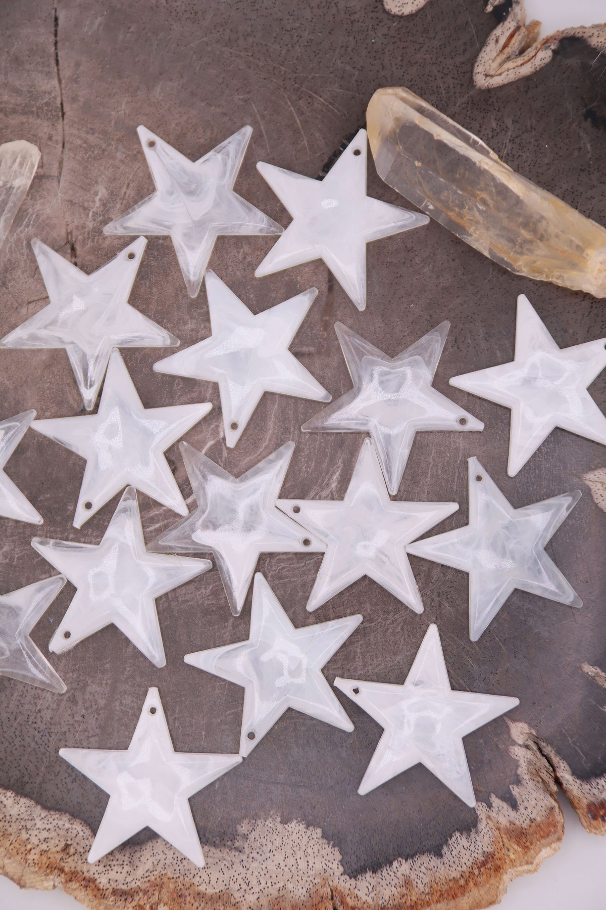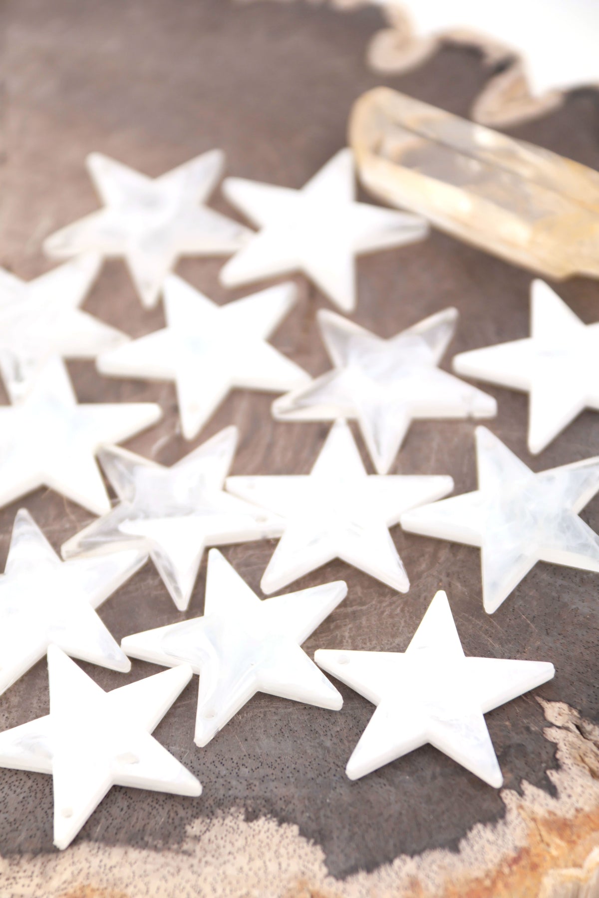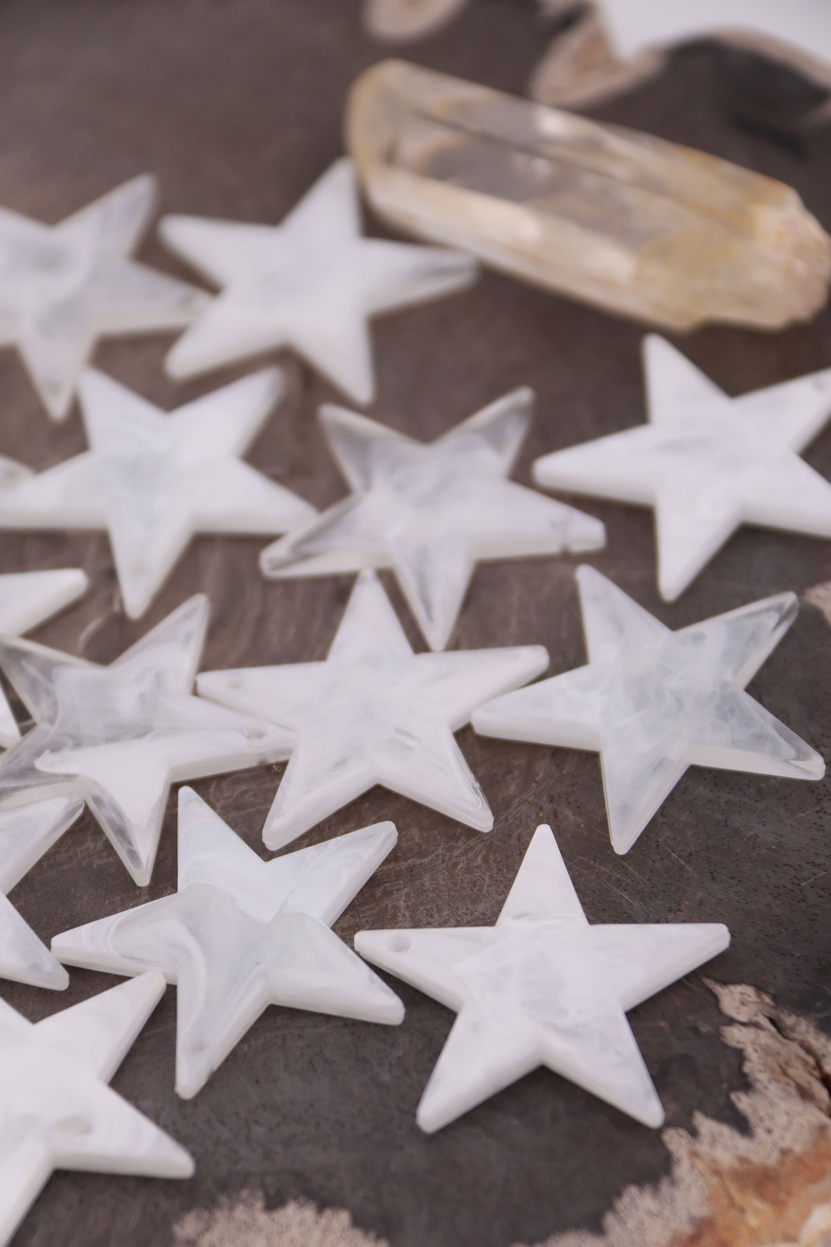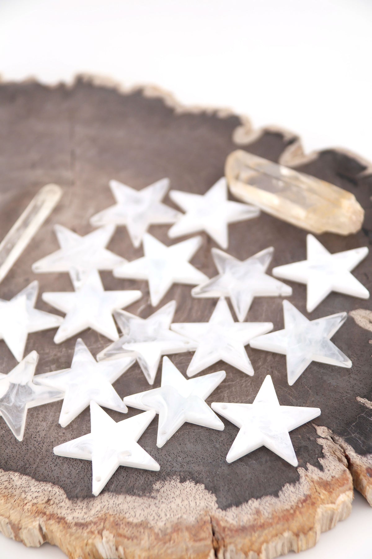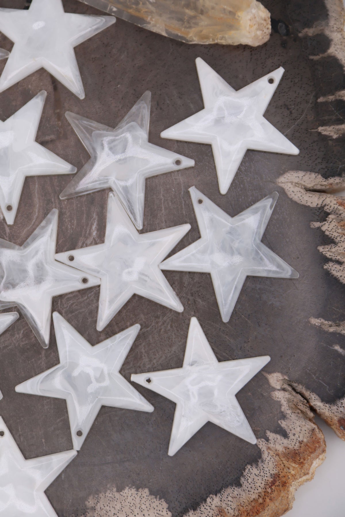 Celestial and mystical, these milky white star charms have a strong vibe. Hand crafted in Germany from resin, they are lightweight and have crisp details. Drilled at the top, you could use a jump ring or wire/cord to attach these to your jewelry creations. Great for using as charms in DIY charm necklaces, purse charms, keychains, and shoe charms.