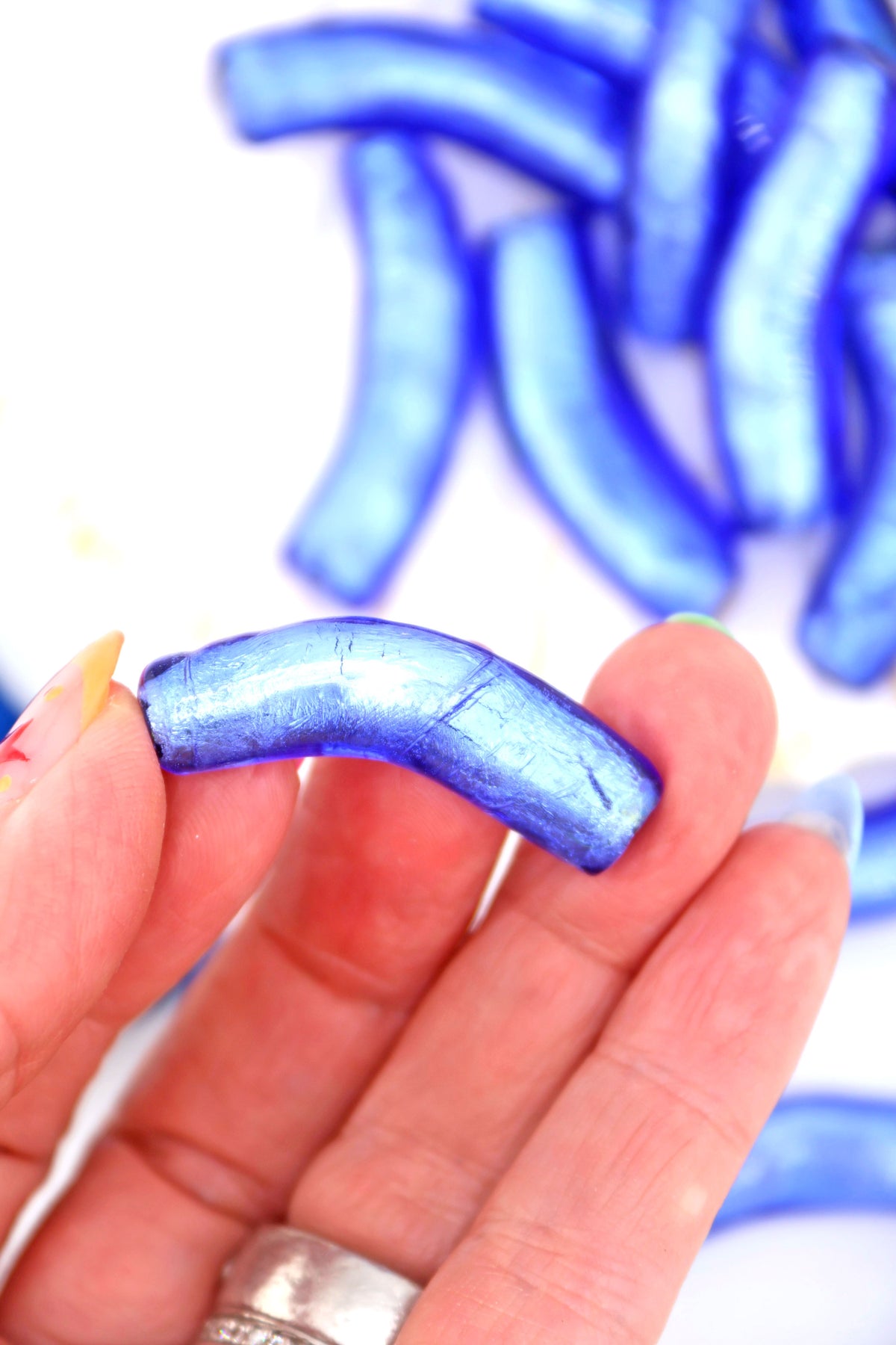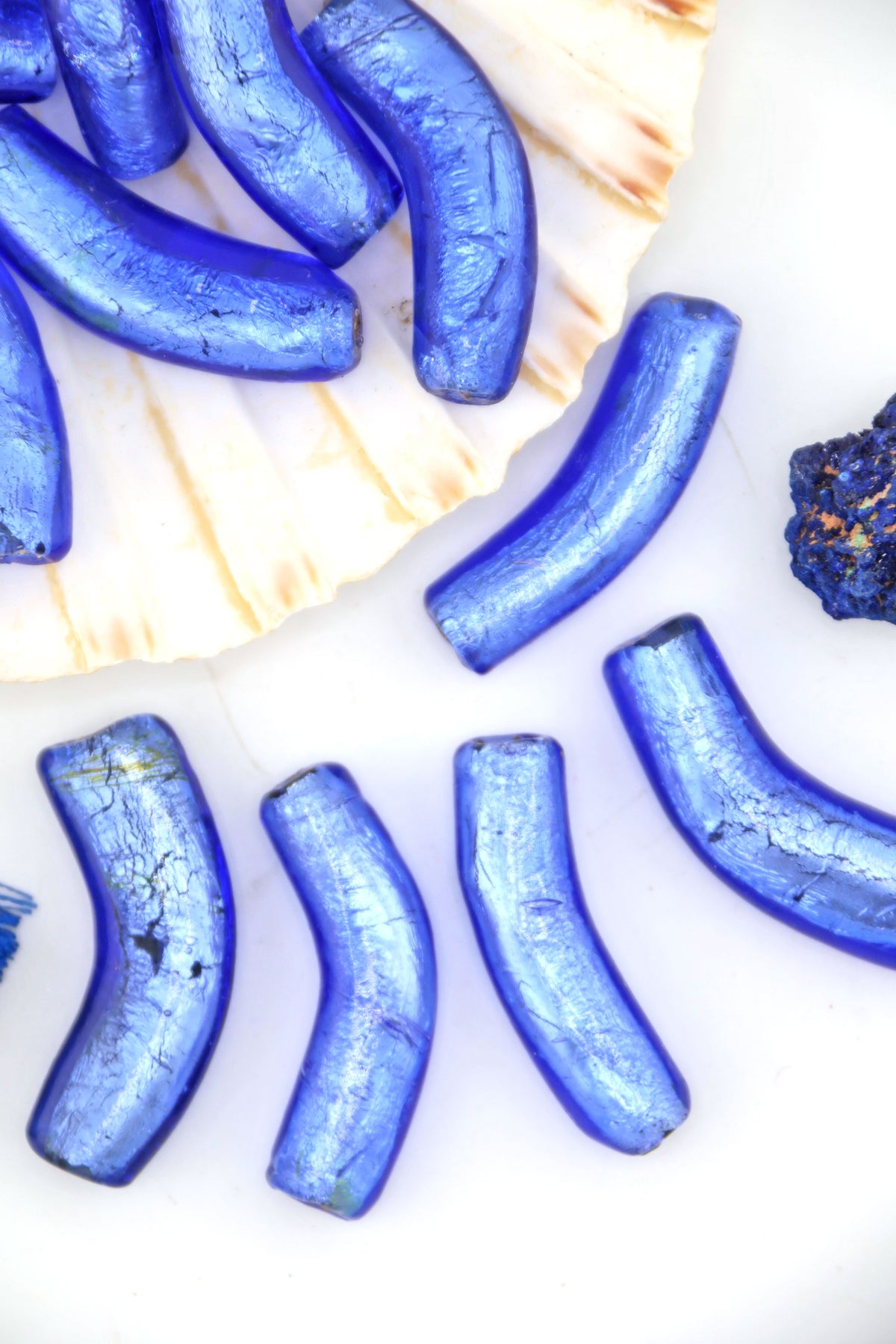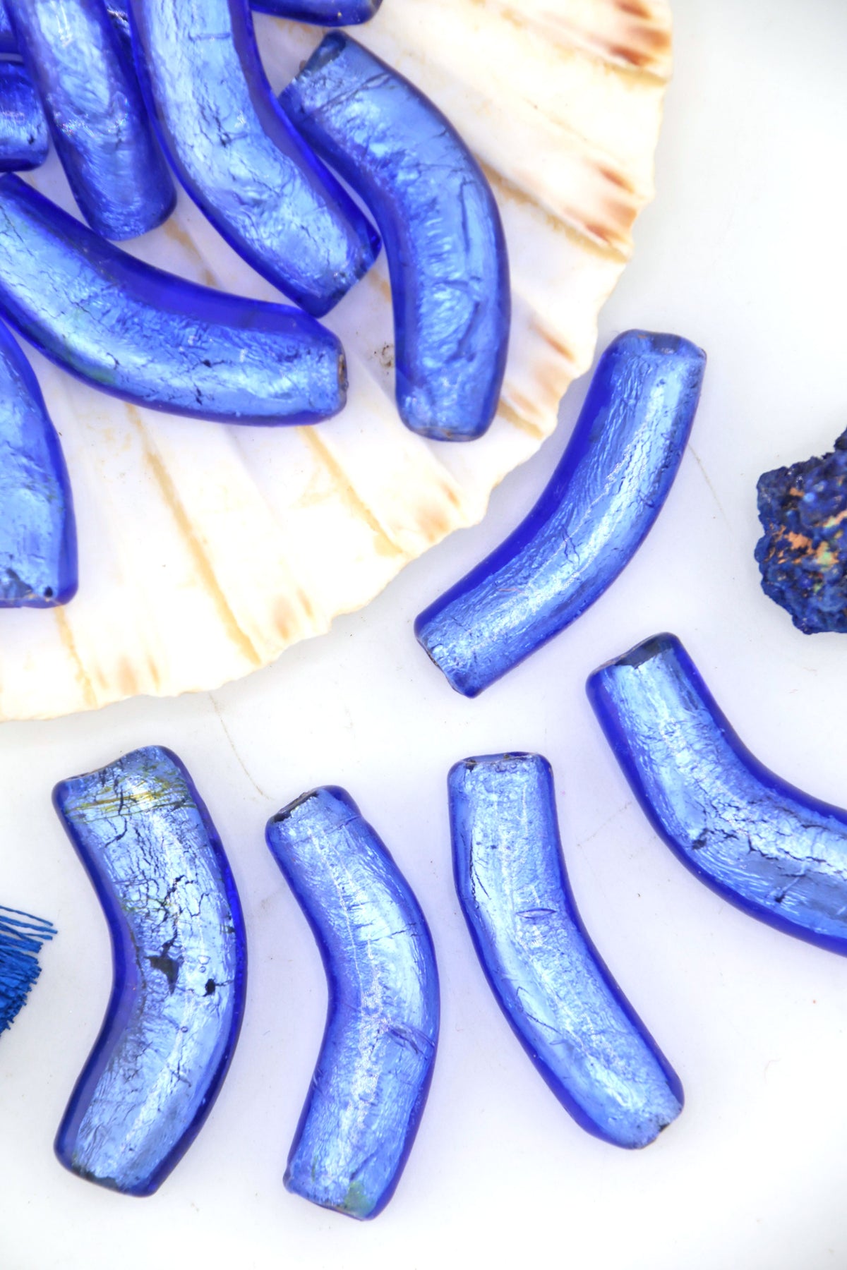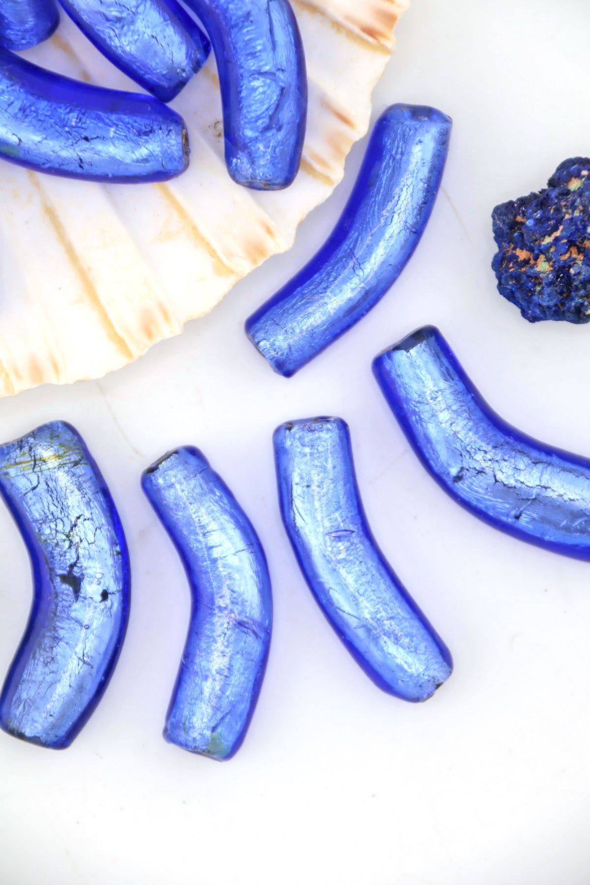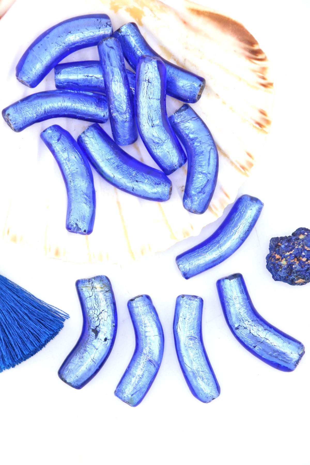 We’ve had these beads in our collection for over 25 years, making them genuinely vintage and increasingly rare. Each bead has a softly curved “elbow” shape, adding movement and an organic feel to finished designs. The foil interior catches the light beautifully, creating depth and a moody, almost celestial shimmer.