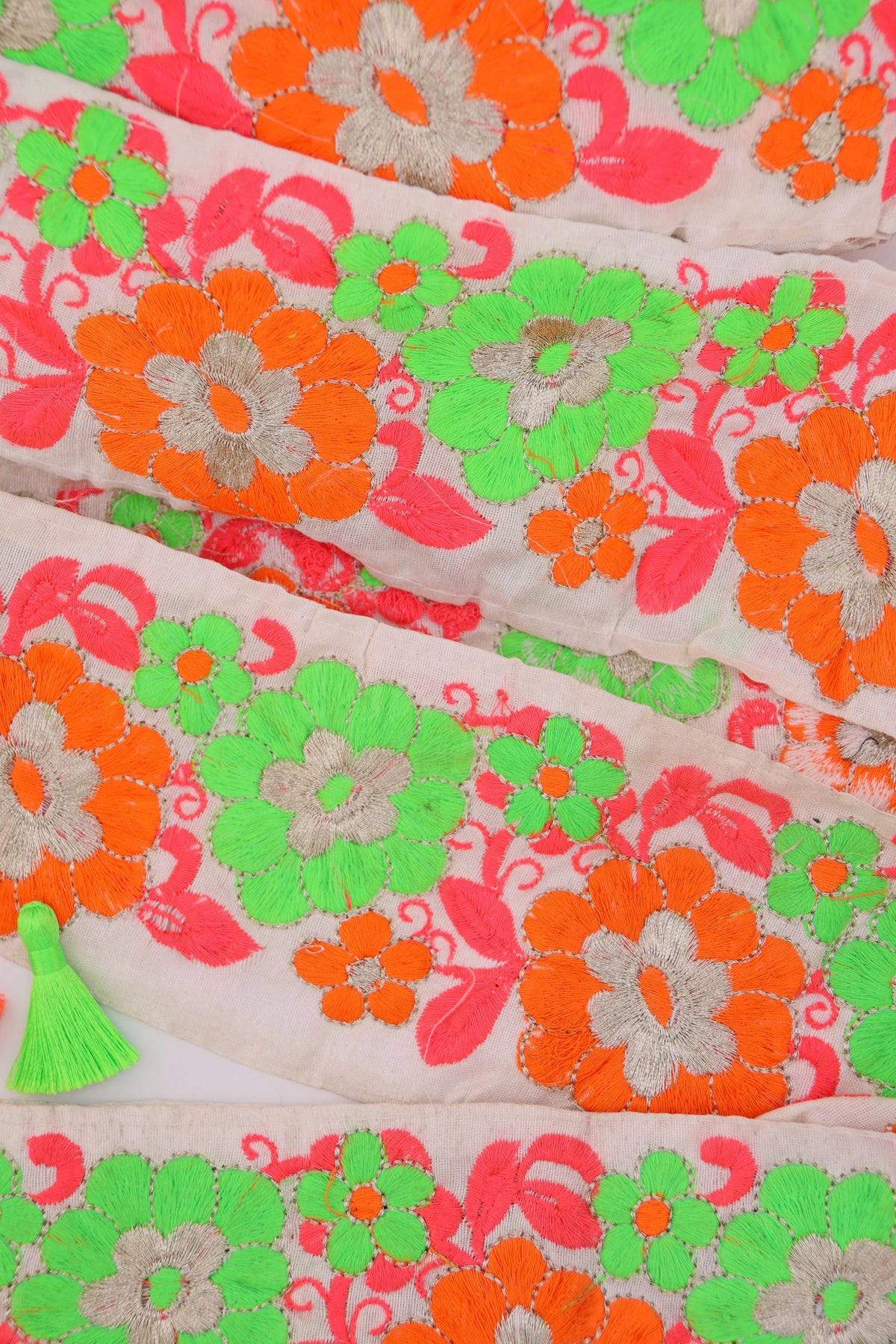 Vibrant, floral, and practically alive, this neon embroidered trim is pure joy on a spool. Neon orange, lime, and hot pink flowers dance across the surface like a neon garden. Silver accent threads add sophistication and sparkle.
