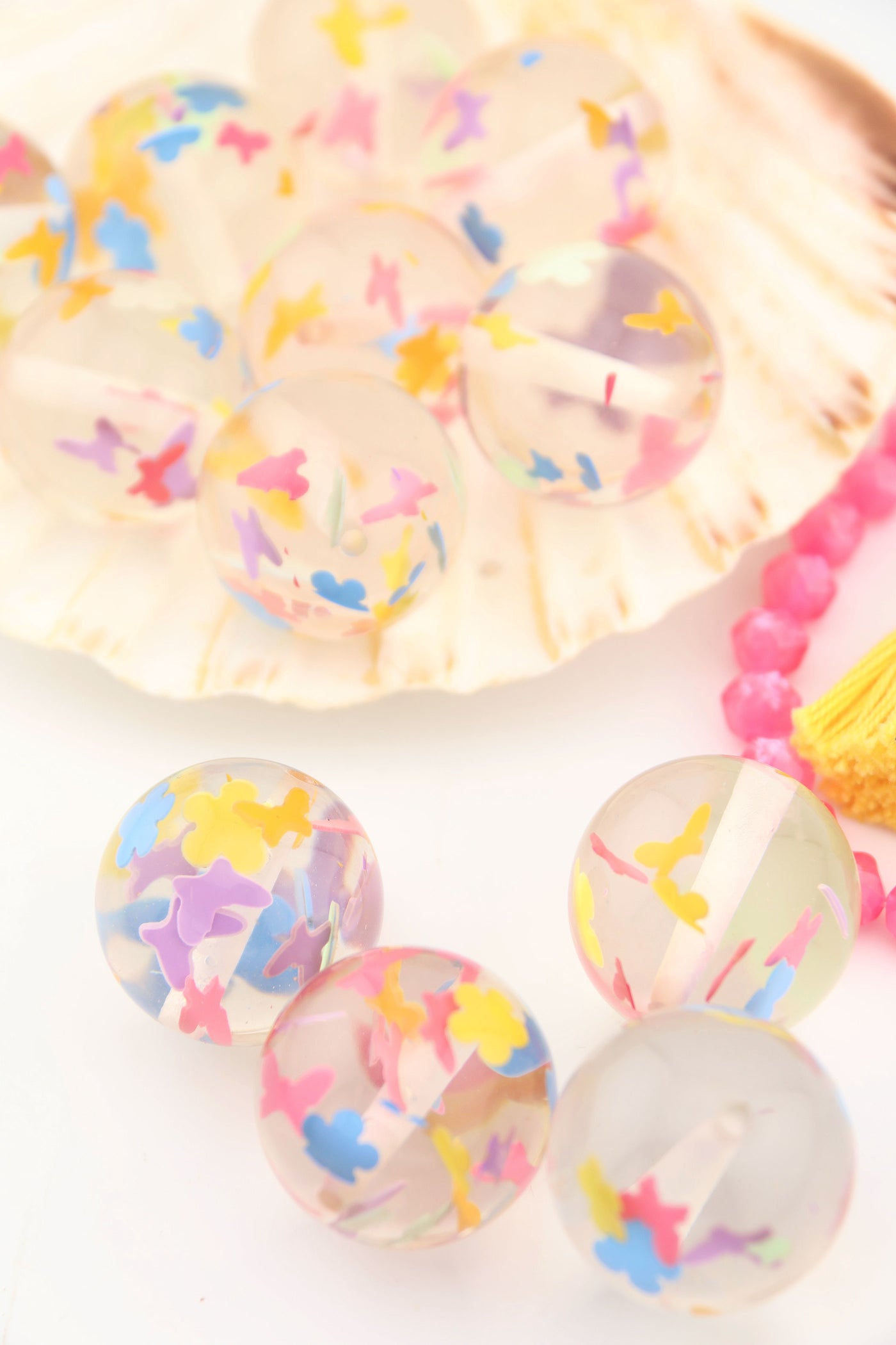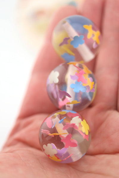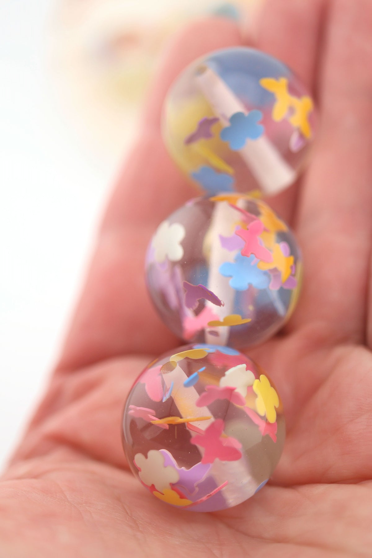 These beads are magical in their own special way. They remind me of my childhood and the large rubber bouncy balls that had glitter and swirls inside them. The resin is wonderfully clear, with butterflies and flowers suspended inside; they give the appearance that they are floating. Made in Italy from polyresin, these are vintage reproduction beads are wonderfully lightweight and high quality.
