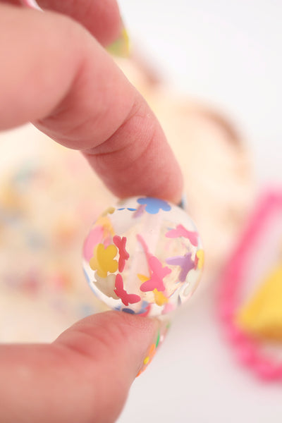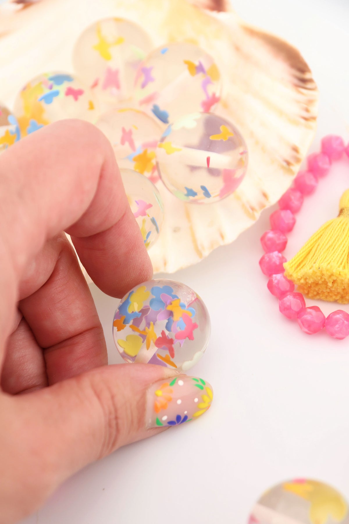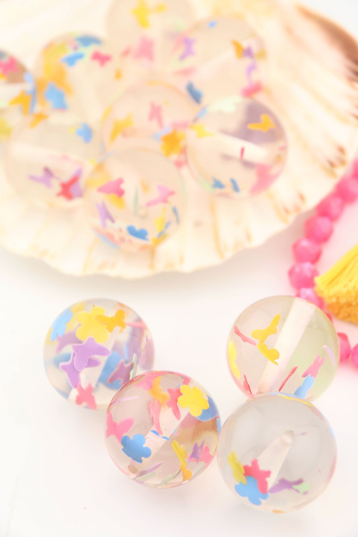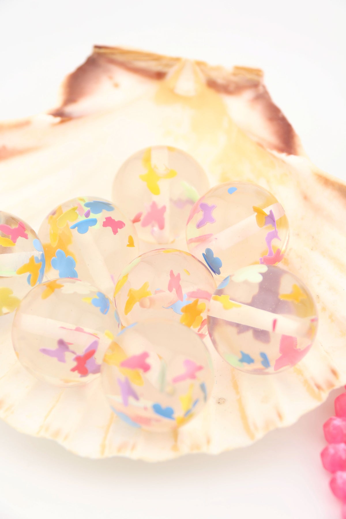 These beads are magical in their own special way. They remind me of my childhood and the large rubber bouncy balls that had glitter and swirls inside them. The resin is wonderfully clear, with butterflies and flowers suspended inside; they give the appearance that they are floating. Made in Italy from polyresin, these are vintage reproduction beads are wonderfully lightweight and high quality.