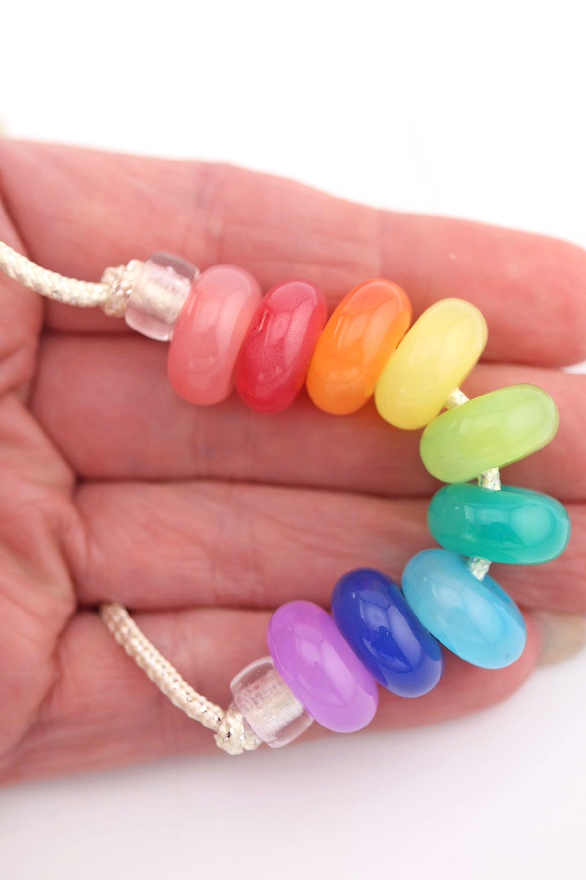 These bright and colorful beads have a large 5mm hole, and will slide on to most chains and ropes.
