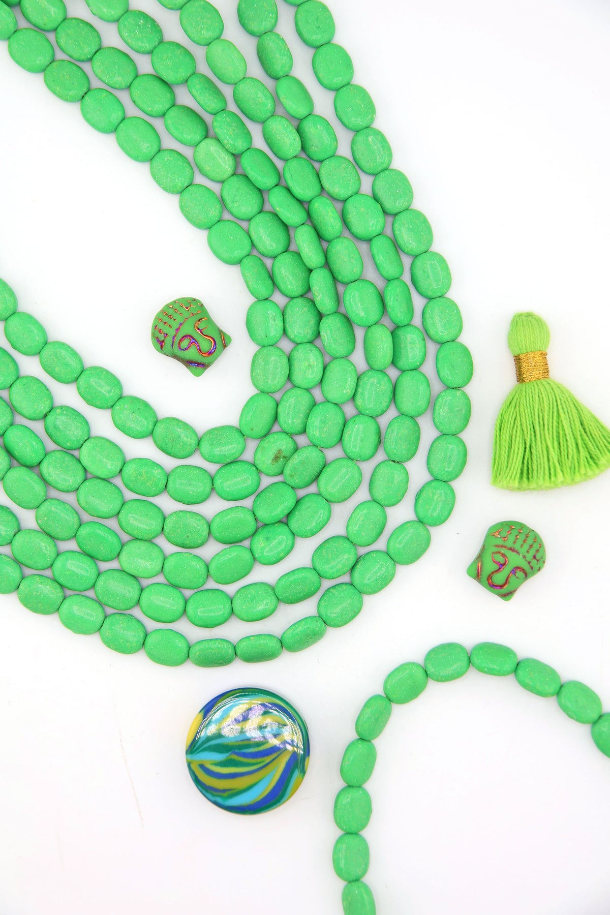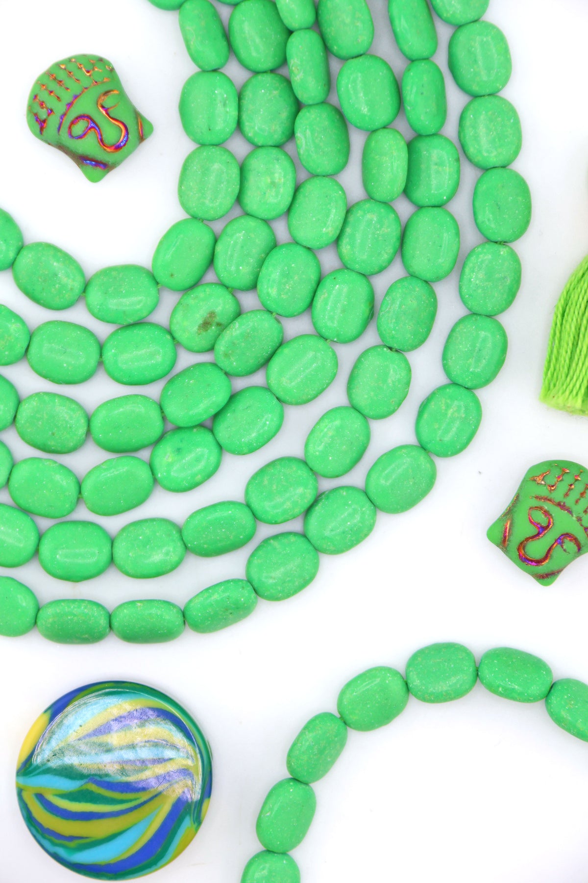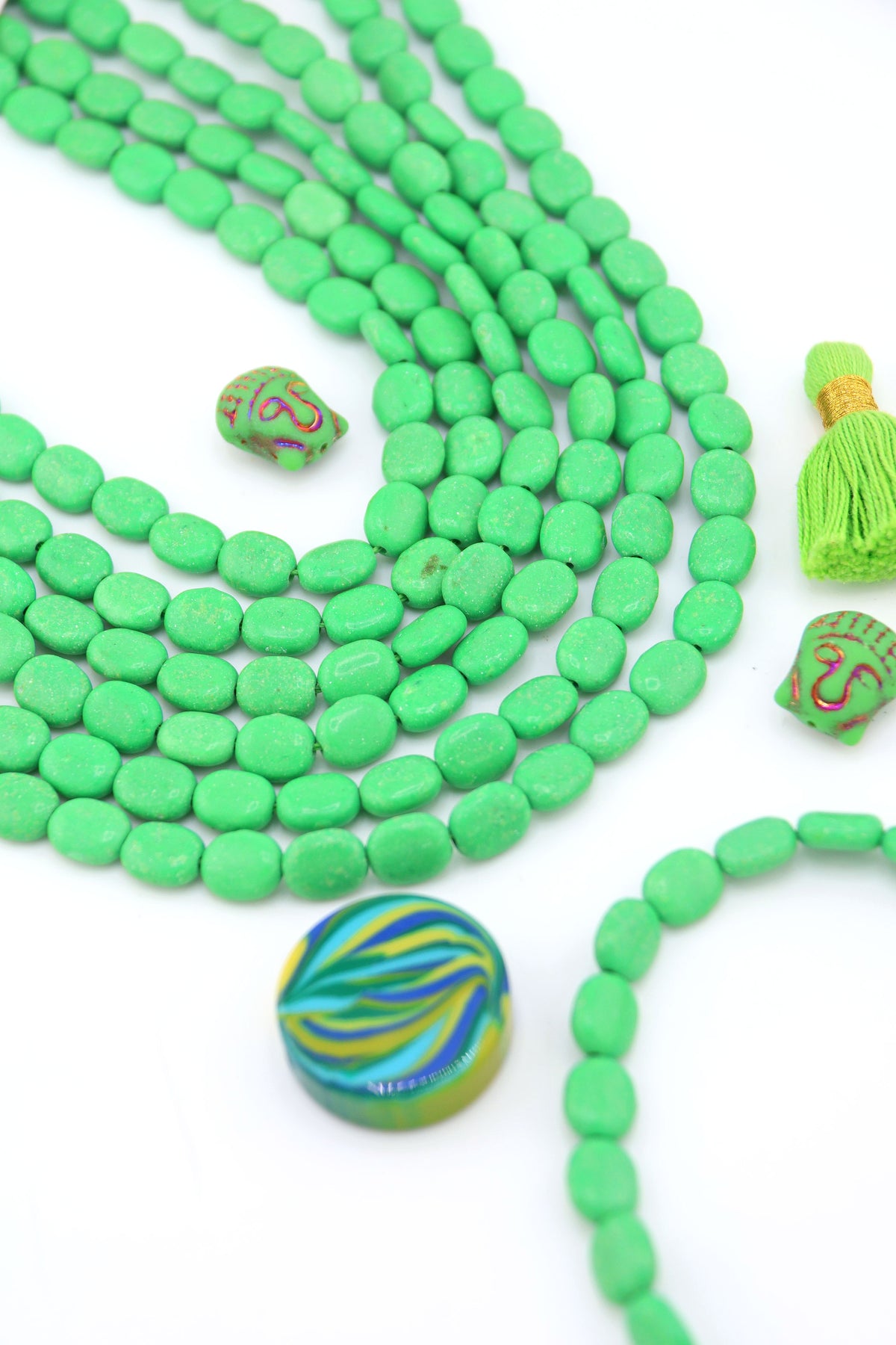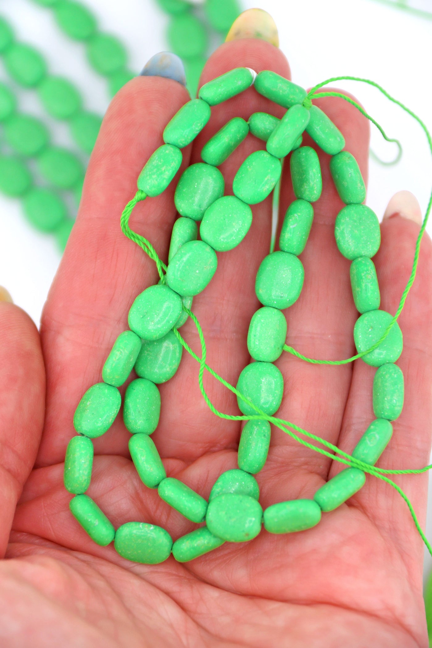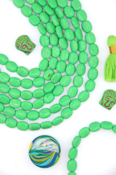 Bright and joyful, these green magnesite beads are such an easy shape to create with. Smooth on the surface, these would be good for using in both bracelets and necklaces. These beads have been in our collection for 15+ years.